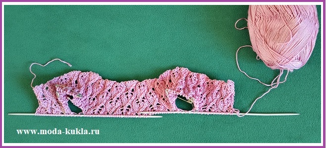 45-55 р: в начале и в конце каждого ряда около кромочной петли вяжем по 2 вм л; и далее вяжем по лицевой и изнанке; 1-й и 5-1 раппорты вяжем платочной вязкой;