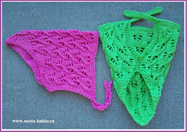 Зеленый чепчик-косынка: набираем 94 петли, из расчета 5 раппортов узора, 2 петли для симметрии, 2 кромочные петли и по 15 петель на завязочки: