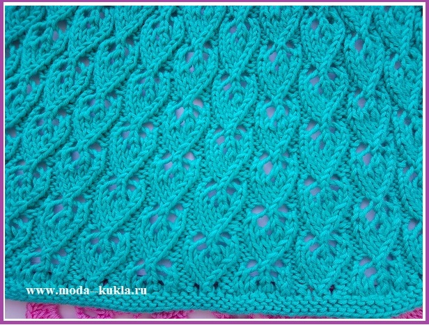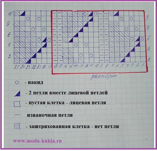 45-55 р: в начале и в конце каждого ряда около кромочной петли вяжем по 2 вм л; и далее вяжем по лицевой и изнанке; 1-й и 5-1 раппорты вяжем платочной вязкой;