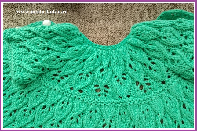 После 2-го ряда вяжем по схеме; на спицах 147 петель, накид тоже петля (из расчета 143 петли на 11 раппортов узора, 2 петли для симметрии (в начале после кромочной вяжем 2 изн) и 2 кромочные петли) и вяжем поворотными рядами из расчета по 37 петель на рукава и на кокетку 73 петли;