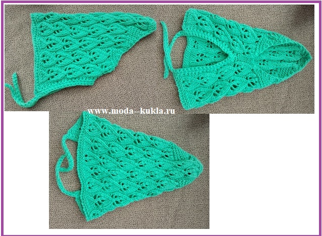 68 р: вяжем платочной вязкой и вяжем по 2 вм л около кромочных в каждом ряду; в конце вязания вяжем 3 петли вместе; нить отрезаем, закрепляем, хвостики прячем;