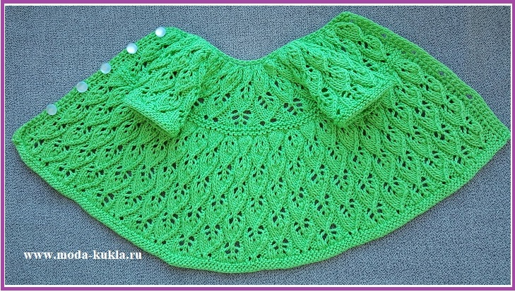 Пряжа "Детский хлопок" (100 г - 330 м, 100% хлопок, Пехорка) или аналогичные, спицы №3, крючок №2,3 или 2,5, ограничители на спицы или круговые спицы, булавки - снять петли рукава, 5 пуговиц для зеленого платья и 6 для розового платья - для застежки по всей длине спинки; Платье вяжем сверху вниз, петли набираются сразу и на рукава, в конце вязание петли собираются по горловине;
